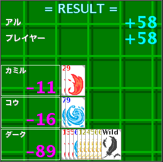 最後がDraw2重ね×3という鬼展開となったので、最後の1枚がDraw2だったプレイヤーこと総八とアル兄さんが同時に勝利。